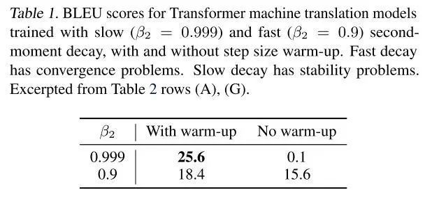 Reddi 团队的文章“On the convergence of adam and beyond. International Confer- ence on Learning Representations”谈到了 Adam 算法中使用快速的二阶矩估计衰减 (即 beta2 设置的较低) 会导致不收敛的问题。本文的作者在实验中也发现了这个问题,并且较慢的衰减 (即较高的 beta2) 会导致训练的不稳定,有无预训练过程对结果影响很大,实验结果见下表: