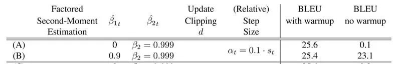 步长一般设置为常量,但是近期一些工作认为使用线性衰减的方法设置步长可以得到更好的优化效果。本篇论文中,作者使用倒数平方根衰减获得更稳定的结果与 Adafactor 方法进行了对比。