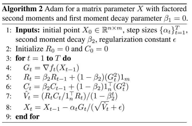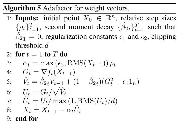 结合上述三条策略,完整的 Adafactor 算法如下所示,其中,算法 4 是针对矩阵形式的参数设计的优化算法,算法 5 则是为向量形式的参数所设计。值得一提的是 Adafactor 算法已经在最新的 TensorFlow 中开源,用户可以通过 TensorFlow 的 optimize 直接调用 Adafactor,源码地址: