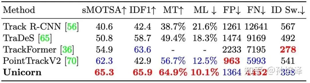 在MOTS Challenge数据集上,Unicorn在sMOTSA和IDF1两项重要跟踪指标上大幅领先于之前的方法,例如PointTrackV2、TrackFormer等。