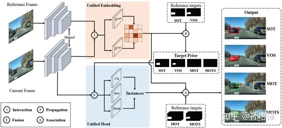 目标先验作为检测头的一个额外输入,是在四个任务之间切换的开关。对于 SOT&VOS,目标先验是通过传播(propagation)得到的目标图,使预测头部能够专注于跟踪的目标。对于 MOT&MOTS,通过将目标先验设置为零,预测头部可以自然地退化成常规的特定类别的检测头部。