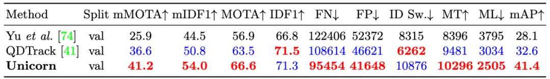在BDD100K数据集上,Unicorn在mMOTA,mIDF1两项关键跟踪指标上均大幅领先之前效果最好的方法QDTrack,mMOTA和mIDF1两项指标分别有4.6%和3.2%的提升。