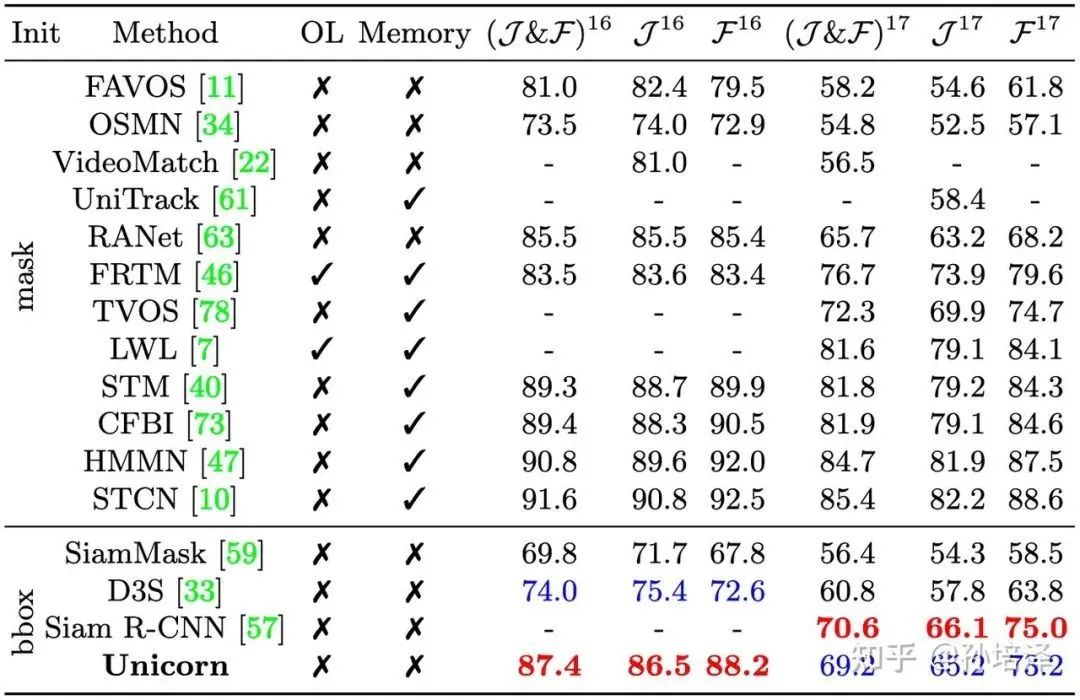 在DAVIS16和DAVIS17数据集上,第一帧无需精确的mask标注、仅使用box初始化,Unicorn仍取得了不错的成绩。在DAVIS16-17上,Unicorn相比于同样使用box初始化的SiamMask来说,J&F指标有17.6%和12.8%的提升!此外,尽管只利用box初始化,Unicorn的甚至也能和一些用mask初始化的方法(UniTrack,RANet等)相媲美。