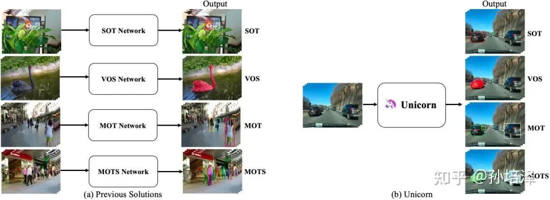 目标跟踪领域主要可分成以下四项子任务:单目标跟踪(SOT),视频目标分割(VOS),多目标跟踪(MOT),多目标跟踪与分割(MOTS)。由于不同子任务在定义与设定上的差异,绝大多数现有跟踪算法都是被设计用来解决单一或者部分子任务的,缺乏向其他任务的拓展能力。显然,他们的长期割裂状态对于跟踪领域的发展并不友好。