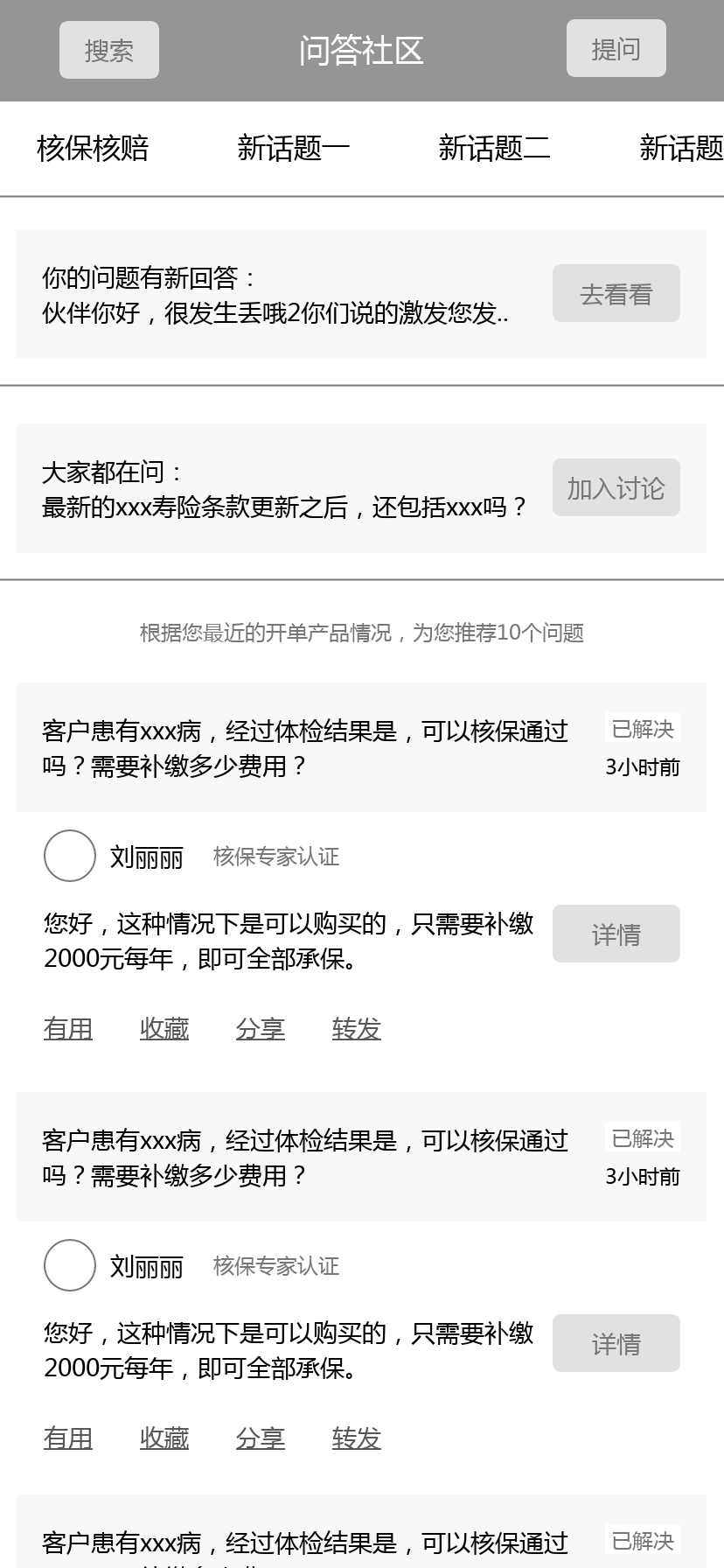 那么,不妨以核保核赔微信群为MVP,构建起以代理人为主要提问者,核保核赔专家为回答者的问答形态社区。这样能够把诸多非标case沉淀在平台内,为后续的契约签订做参考,有效提升效率。