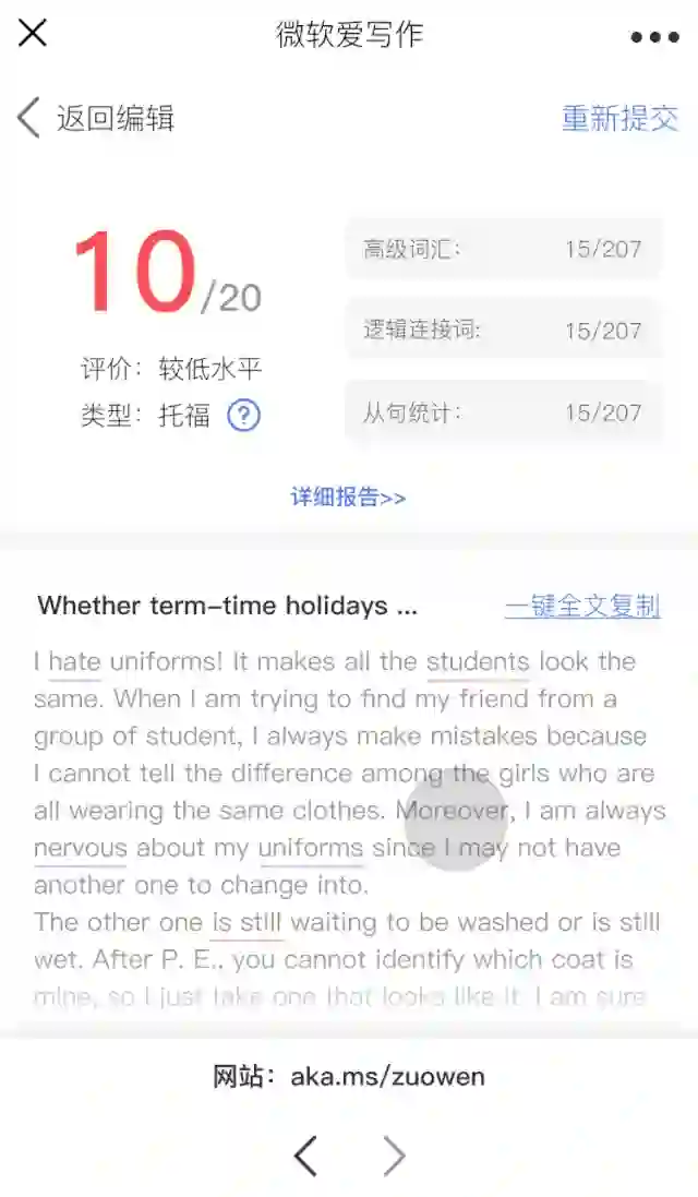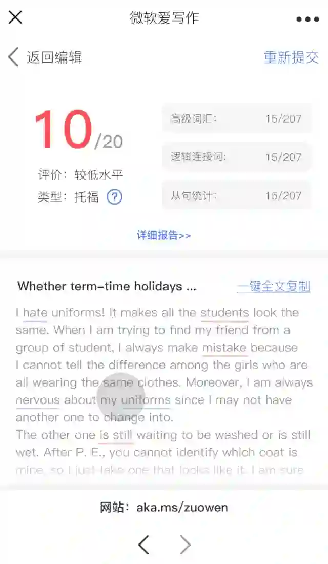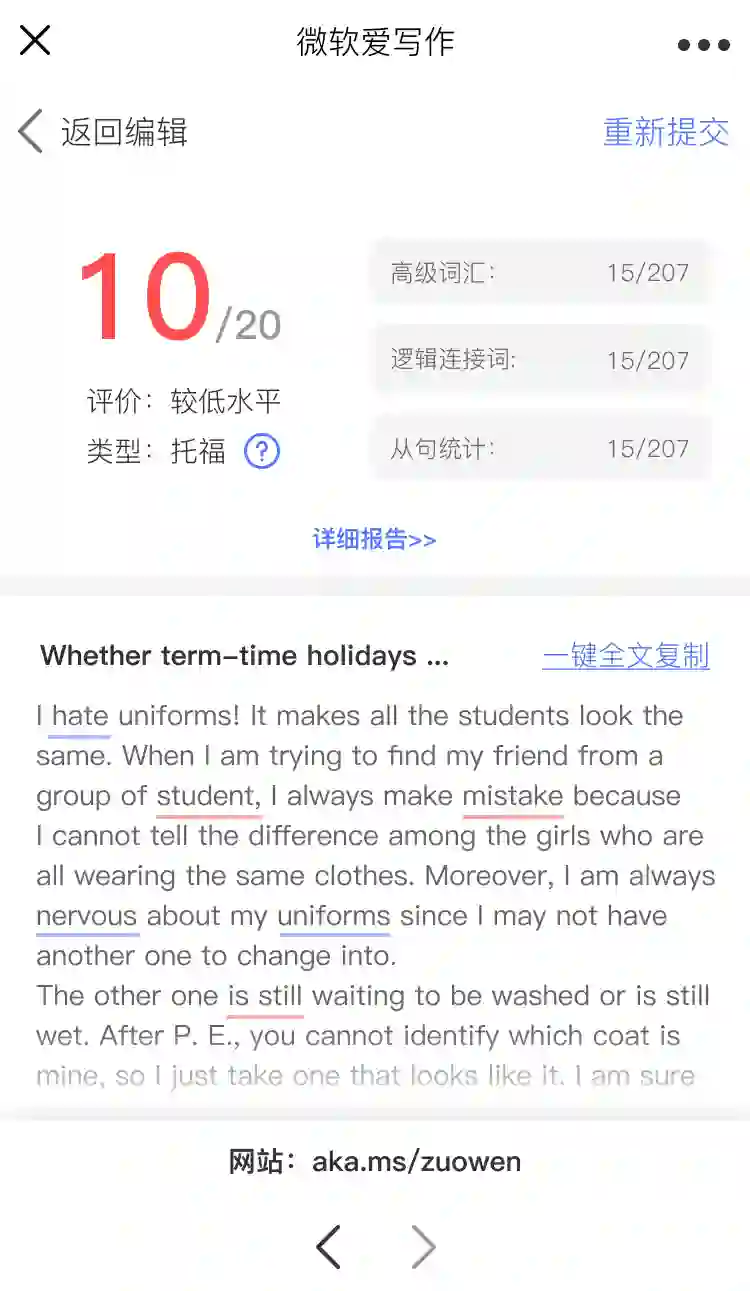 作文打分是很多学生都十分关心的环节,分数固然重要,但分数背后的信息更重要。基于此前微软小英“作文打分”功能和“爱写作”网页版积累的丰富经验,升级后的“爱写作”作文打分功能更加强大,不仅可以对所有文章进行一般性评分,还可以测试同一篇作文在不同考试类型中的得分状况。因为不同的考试在词汇、语法、文章结构、连贯性、切题程度等维度上对作文有不同的考量标准,所以“爱写作”在给出分数的同时,还可以有针对性地评价一篇作文在上述这些维度上的表现,并给出反馈建议,以便学生更好地进行自我提升。目前,“爱写作”支持小学、中考、高考、四级、六级、考研、托福、雅思共八大英语考试类型。