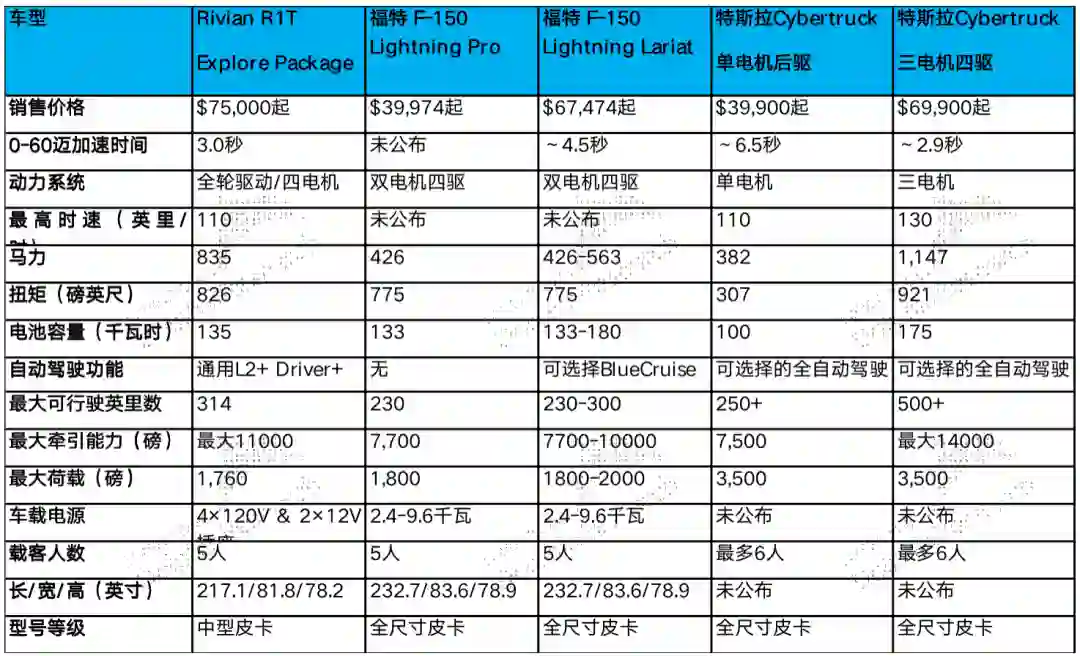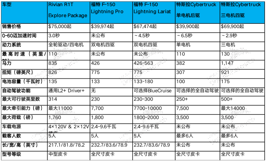 我们对比下产品参数,Rivian的R1T的参数大多由于福特F-150lightning,但弱于CyberTruck。