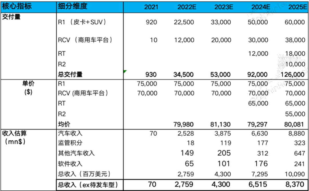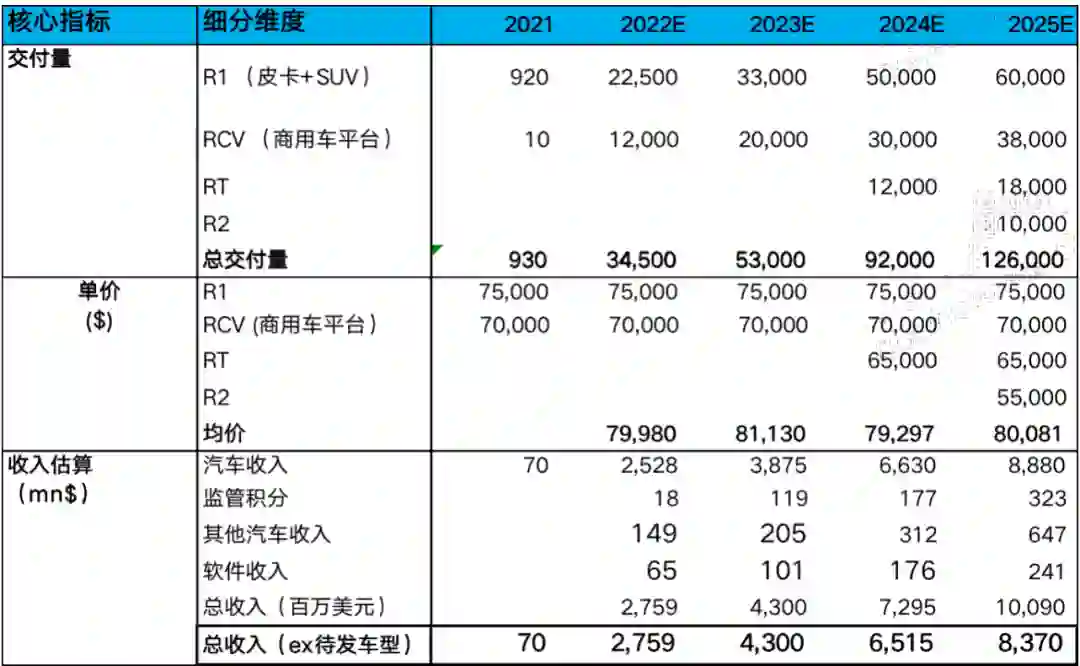 Rivia目前的资金也足够其开辟新的生产线,所以我们保留对其新生产线的预期,但新产品依然会面对福特和特斯拉电动皮卡的凶猛竞争,所以我们也下调了预期量。具体见下图: