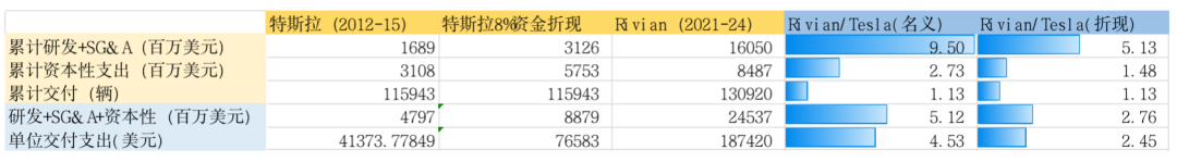 Rivian所花费在每辆汽车上的研发+销售、一般和管理费用是同期特斯拉折现后的2.45倍。而十年前电动汽车的生产技术存在更多的未知,市场对