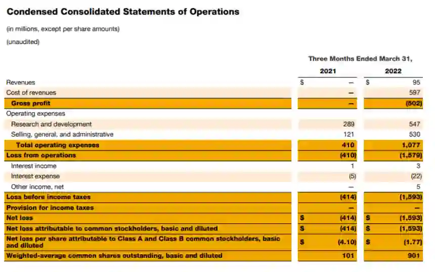 5月12日,Rivian发布了2022年一季度财报,第一季度Rivian的总收入为9500万美元,远远低于市场预期1.3亿美元;净亏损为15.93亿美元,上年同期为4.14亿美元;调整后每股亏损为1.43美元,略好于市场预期的1.45美元。