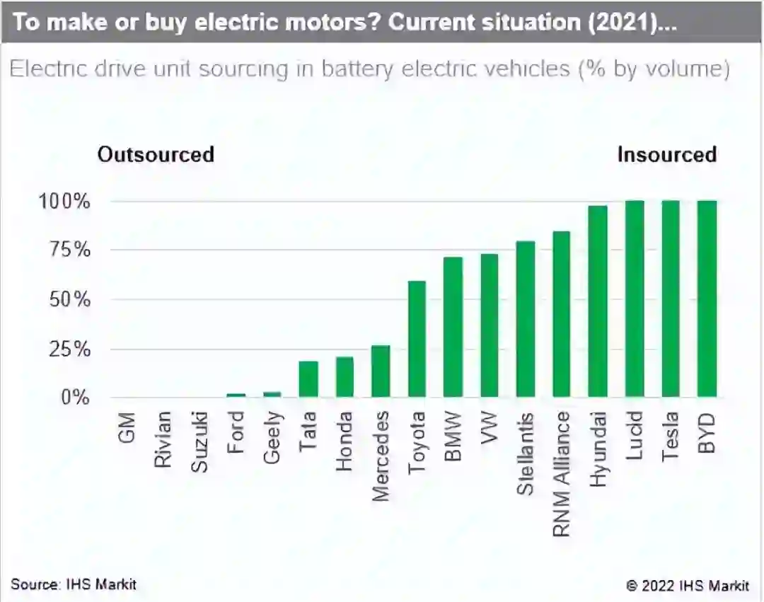 根据IHS Markit的统计,丰田、宝马、大众、Stellanitis、现代、Lucid、特斯拉、比亚迪自己生产的转子部件都在50%以上,电动车企业基本百分百自研。