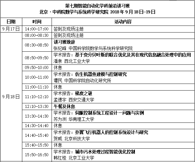 中国自动化学会将于2018年9月18日-9月19日在北京•中国科学院数学与系统科学院举办第7期智能自动化学科前沿讲习班,主题为“智能、控制与数学”,此次讲习班由中科院数学与系统科学研究院张纪峰研究员和西北工业大学潘泉教授共同担任学术主任,邀请业界多位知名专家作主题报告,分享交流智能控制的学术前沿、产业发展及应用实现。