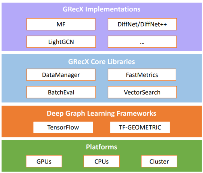 GRecX是基于tf_geometric框架的GNN-based的开源推荐算法框架,致力于构建高效统一易扩展的GNN-based推荐算法基准(Benchmark)库。GRecX实现了MF算法作为基础推荐算法,并实现现有最有效的且最有影响力的GNN-based推荐算法作为基准算法,如NGCF、LightGCN等。通过深度优化GRecX框架的内核,我们大幅度缩短了模型训练时间,有效提升了基准推荐算法性能。