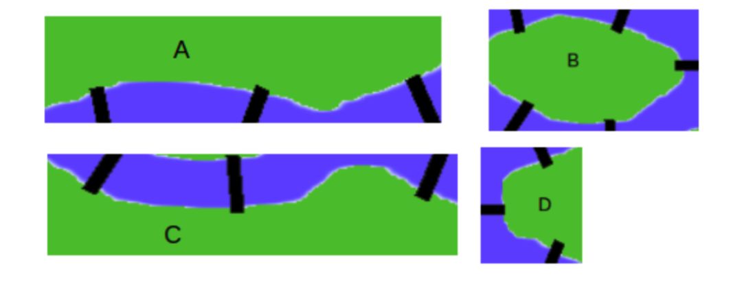 上图中有四个不同的位置:两个岛屿(B和D),两个大陆(A和C)和七个桥梁。让我们先分别看看每块土地,并尝试找到模式(如果有的话):