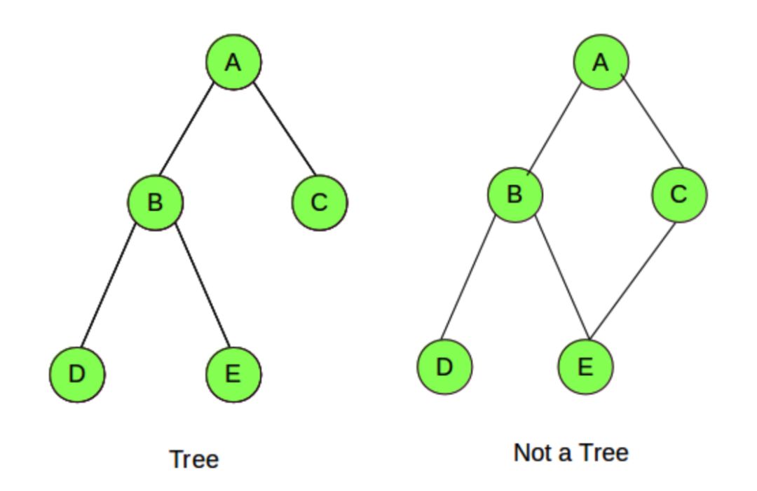 在上面的例子中,第一个图没有循环(也就是树),而第二个图有一个循环(ABECA,因此它不是树)。