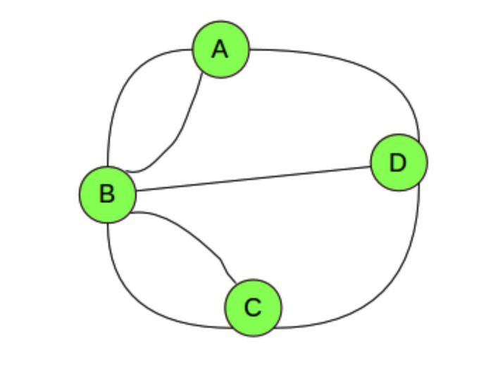 这里,A,B,C和D代表陆地,连接它们的线是桥。我们可以计算每个顶点的程度。