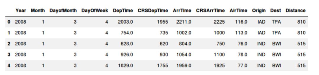 这里,CRSDepTime,CRSArrTime,DepTime和ArrTime分别代表预定的出发时间,预定的到达时间,实际出发时间和实际到达时间。出发地和目的地的旅程的起点和终点。