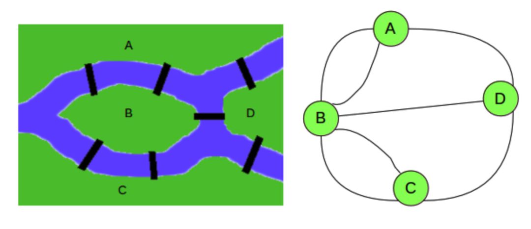 这就是使用图形和欧拉的路径来解决经典的柯林斯堡七桥问题。这基本上是图论的起源。感谢Leonhard Euler!