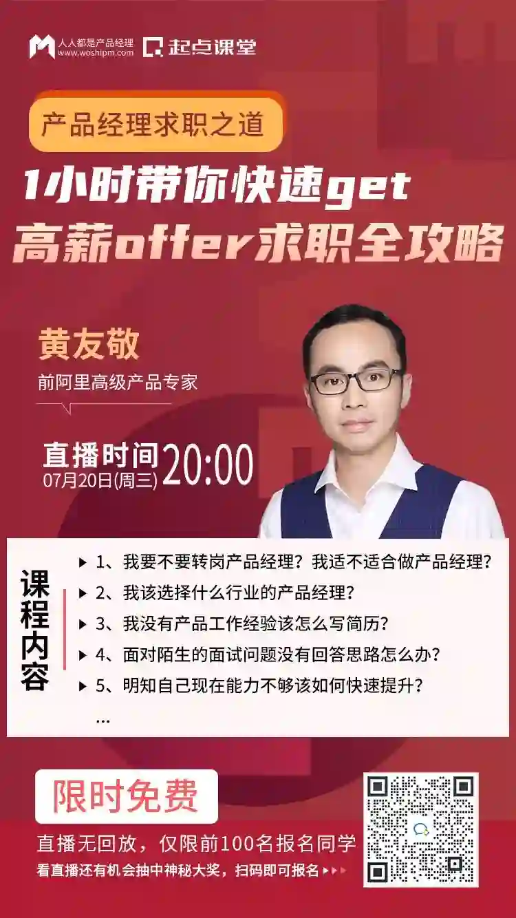 7月20日晚20:00-21:00,为了帮助更多想要转岗入行产品的新人们,能够更顺利地求职产品岗,人人都是产品经理&起点课堂特邀前阿里资深产品专家@黄友敬老师,用1小时的时间,跟大家聊聊不同背景的同学,在求职产品岗前中后需要做的一些准备,从行业选择、简历撰写,到面试技巧及回答思路,再到如何提高自己的产品专业能力,希望能够帮助大家在金九银十前能够进行更充分的准备,轻松拿下心仪的offer!