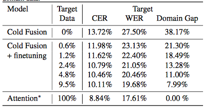 表 5. 微调后的声学模型在目标训练数据的子集上的结果。最后一行代表在所有目标域数据上进行训练的注意力模型。