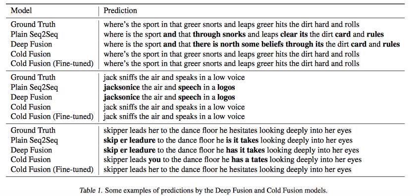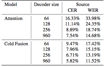 表 4. 解码器维度对该模型的性能影响。冷聚变模型的性能随着解码器变小而缓慢下降,这证明冷聚变模型的有效任务能力比无聚变的模型大得多。
