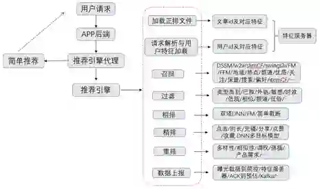 推荐引擎在推荐系统当中起到类似于一个调度器的作用,用户的请求从APP后端发往推荐引擎,推荐引擎调用各种服务,比如召回服务和排序服务,然后按照规则对各种服务返回的结果进行处理,最后将处理好的TopK内容返回给用户。以信息流推荐系统为例,典型的推荐引擎架构如下: