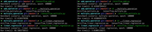 事实上,我个人在学习 TensorFlow 过程中,通过实现一个 TensorFlow-like 的项目,不仅惊叹与其源码和接口的设计精巧,也加深了对声明式编程、DAG 实现、自动求偏导、反向传播等概念的理解。甚至在 Benchmark 测试中发现,纯 Python 实现的项目在线性回归模型训练中比 TensorFlow 快 22 倍,当然这是在特定场景下压测得到的结果,主要原因是 TensorFlow 中存在 Python 与 C++ 跨语言的切换开销。