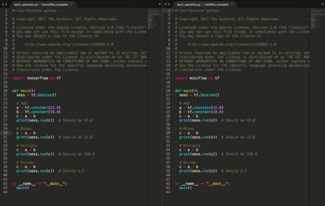 这个项目就是 MiniFlow,一个实现了链式法则、自动求导、支持命令式编程和声明式编程的数值计算库,并且兼容 TensorFlow Python API。感兴趣可以在这个地址参与开发 https://github.com/tobegit3hub/miniflow ,下面是两者 API 对比图。