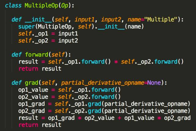 那么用户可以定义的最小操作,也就是 Op,需要平台实现基本的算子,例如 ConstantOp、AddOp、MultipleOp 等,而且用户实现自定义算子时可以加入自动求导的流程中,并不影响框架本身的训练流程。参考 TensorFlow 的 Python 源码,下面我们定义了 Op 的基类,所有的 Op 都应该实现 forward() 和 grad() 以便于模型训练时自动求导,而且通过重载 Python 操作符可以为开发者提供更便利的使用接口。