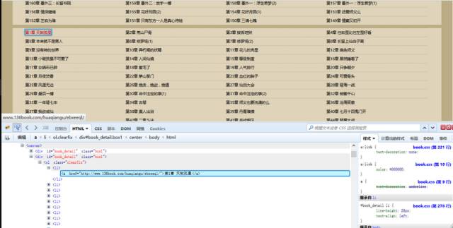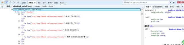 这样我们可以看到,每一章的链接地址都是有规则地存放在<li>中。而这些<li>又放在<div id=”book_detail” class=”box1″>中。