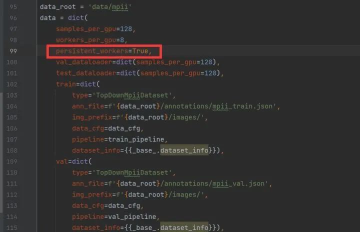 为了加速训练我开启了persistent_workers,由于mmpose优秀的注册器机制,我可以在配置文件中直接手动添加这个参数,而不需要去修改builder.py文件: