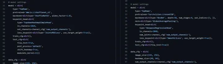 去翻了翻文档里已有的模型记录,虽然当前mmpose并没有轻量模型+回归方法的baseline,但我找到了ResNet50+Regression和ShuffleNetV2+Heatmap在COCO上的两个baseline,所以我很自然地可以参考这两个配置文件来搭建我的目标。