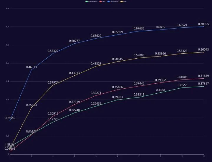 由于是用的一样的训练配置,可以看到训练集上指标还低于验证集,所以按理来说还有很大的调参空间,性能应该还能再继续提升一波。这个提升其实也不意外,对backbone加重参数技巧带来提点也是目前业务上必加的技巧了,由于本文的目的不在于改进backbone,而且backbone替换带来的涨点,跟原先基于shufflenetv2的heatmap方法精度进行对比也不公平,所以这里只是稍微展示一下效果。