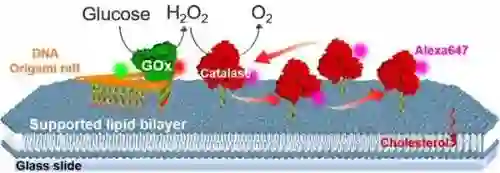 上海应物所物理生物学研究室博士研究生孙乐乐,高延静在研究员李迪、樊春海等指导下,基于 DNA 折纸术(DNA origami)发展了一种对界面上酶级联反应中的单个酶分子运动轨迹实时成像的方法,并对酶分子趋向运动机制作出解释。研究人员以胆固醇修饰的DNA分子为锚定链,并利用胆固醇分子可以嵌入磷脂双层膜的特点,将酶分子固定在二维磷脂分子界面。研究发现,不同锚定手段可以控制酶分子在二维磷脂界面上的运动速度。其中,利用双链 DNA 动态锚定(dynamic tethering)的酶分子,可以在二维界面上自由扩散;而利用 DNA 折纸筏(origami raft)静态锚定(static tethering)的酶分子,则固定在磷脂膜上不动。基于此,科研人员在磷脂双分子层的二维界面上构建了一个酶级联反应:其中上游的葡萄糖氧化酶在界面上固定不动,而下游的过氧化氢酶可以在界面上自由扩散。利用全内反射显微镜,他们实时观测了单个酶分子的运动轨迹。研究发现:以葡萄糖氧化酶分子为坐标中心,下游的过氧化氢酶分子的平动速率确实随上游底物葡萄糖的增加而加快,但上下游酶分子的相对空间距离并未随酶促反应而改变。他们利用 Einstein relation 计算了界面上过氧化氢酶分子的自旋弛豫时间,发现过氧化氢酶的转动速率大大快于其平动速率,过氧化氢酶分子转动一圈的时间内,其平动距离仅为其自身直径的1/6,即使在酶促反应中,酶分子也并不存在趋向运动,趋向运动是平动与转动的竞争平衡结。