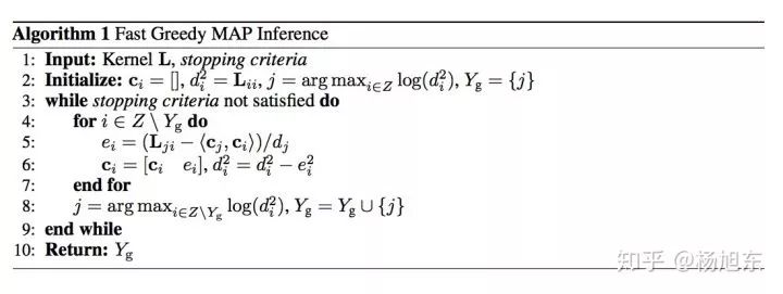 行列式点过程的MAP求解是一个复杂的过程,Hulu的论文中提出了一种改进的贪心算法能够快速求解,该算法的时间复杂度为 ,
