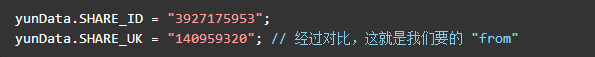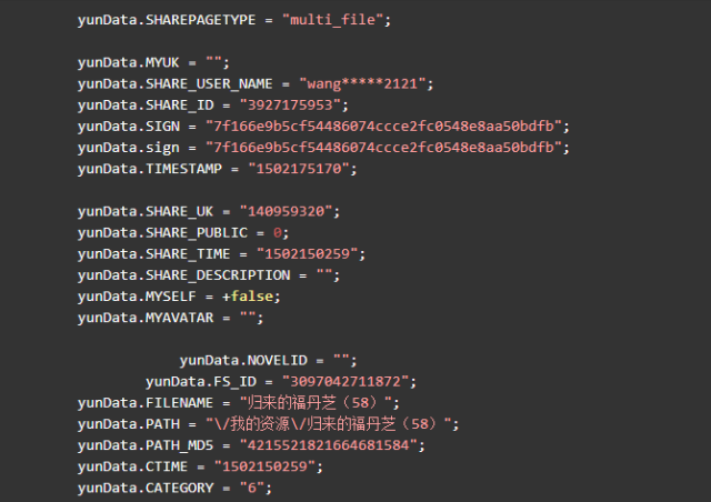 定位到4个shareid,前三个与该资源无关,是其他分享资源,最后一个定位到该 html 文件的最后一个标签块里。双击后可以看到格式化后的 js 代码,可以发现我们要的信息全都在里边。如下节选: