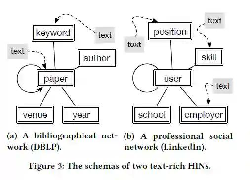给定HINs的类型,网络模型G=(T,R)用于获取HIN中节点类型和边缘类型的元信息。Figure 3a中说明了DBLP网络的模式,其中论文节点可能有来自内容的其他文本信息,而关键字节点可能与维基百科的描述相关。相似的,Figure 3b中的社交网络包括5个节点类型,这些节点包括技能,雇主和职位等。