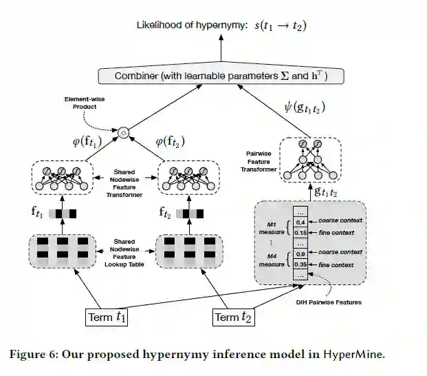 这个模型推测t1与成为t2上位词的可能性,利用高精度模式来获取上位词对,然后用HIN对信息编码并生成多粒度特征。这些特征可以提高召回率。尤其,使用HIN嵌入将网络信号编码为节点特征,并使用DIH在文本粒度上将网络信号编码为成对特征。