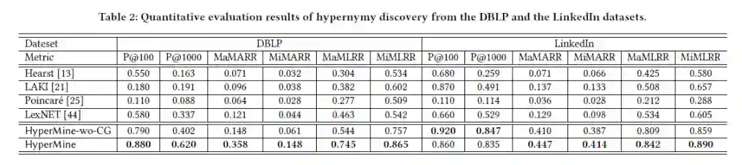 总体而言,HyperMine的方法在两个数据集中所有指标下均大幅度超越了所有基线,而LinkedIn数据集中的P @ 100仅一个例外。HyperMine模型在DBLP中明显优于HyperMine-wo-CG,并且与LinkedIn数据集中的HyperMine-wo-CG相比具有竞争优势。值得注意的是,LexNET在所有基准中都比较出色。但是,它的性能仍然明显不如HyperMine和HyperMine-wo-CG,这证明了在上位词探索中引入网络信号的好处。同样,仅以语料库作为输入,Hearst性能远不及LexNET,相比之下,k取100,LexNET与Hearst类似,而取1000时,明显好一些,这就证实了Hearst倾向于有限的术语对。之所以选择Poincaré作为基线,是因为它代表了一系列与上位相关的研究,并且以图形或网络作为输入。实验结果表示,Poincaré的效果最差,这可能是因为该算法并非旨在从数据中发现上位词,此外,LAKI的性能通常也比其他两种基于HyperMine的模型差,但LinkedIn在K取100时例外。