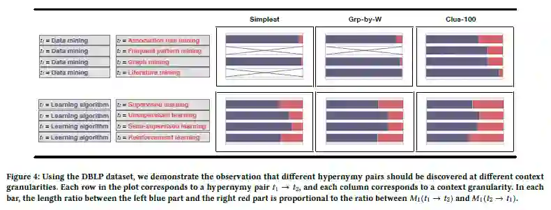 Figure 4中左边每行对应一个上位词对t1 →t2,右边对应3个不同粒度:Simplest,,Grp-by-W和 Clus-100,Simplest有最好的粒度,Clus-100为最粗糙的粒度。右边表中的长度条蓝色表示的t1是t2的上位词的概率,红色表示的t2是t1的上位词的概率。表中没有可视化的是因为M1为0。