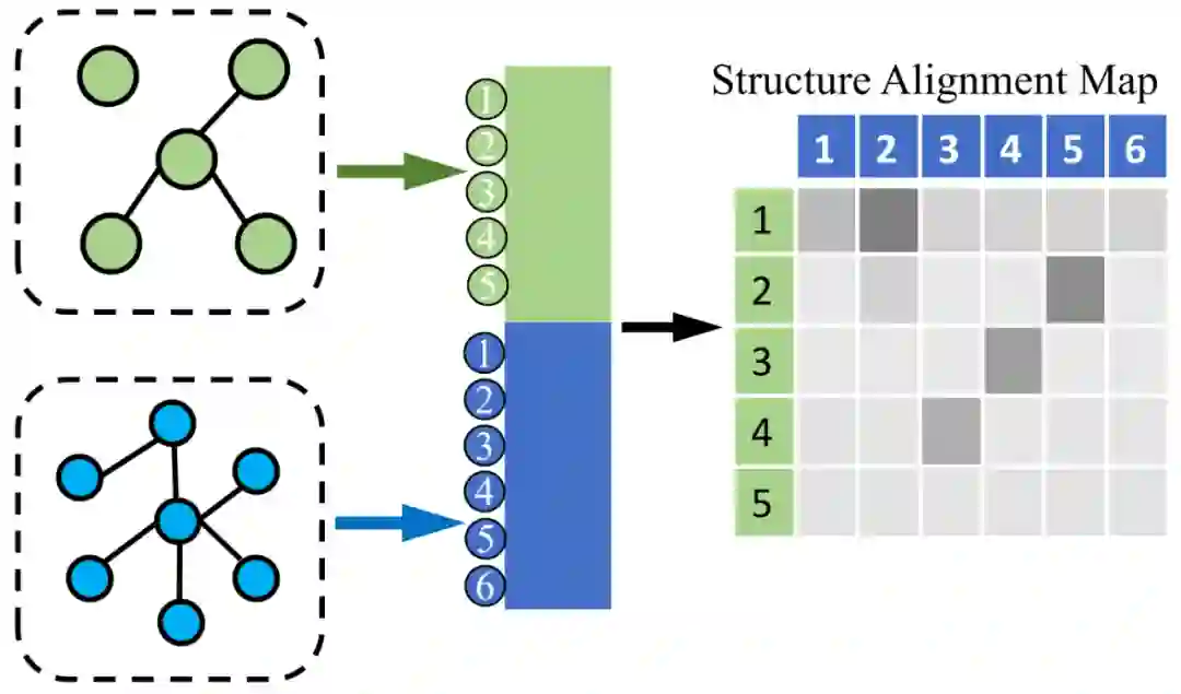 图结构对齐的步骤可以总结为以下两步:(1)通过分解节点标识符的相似性矩阵获取节点表示 (2)通过有效的数据结构,利用贪婪算法匹配两个图之间节点的embedding 表示来完成对齐。