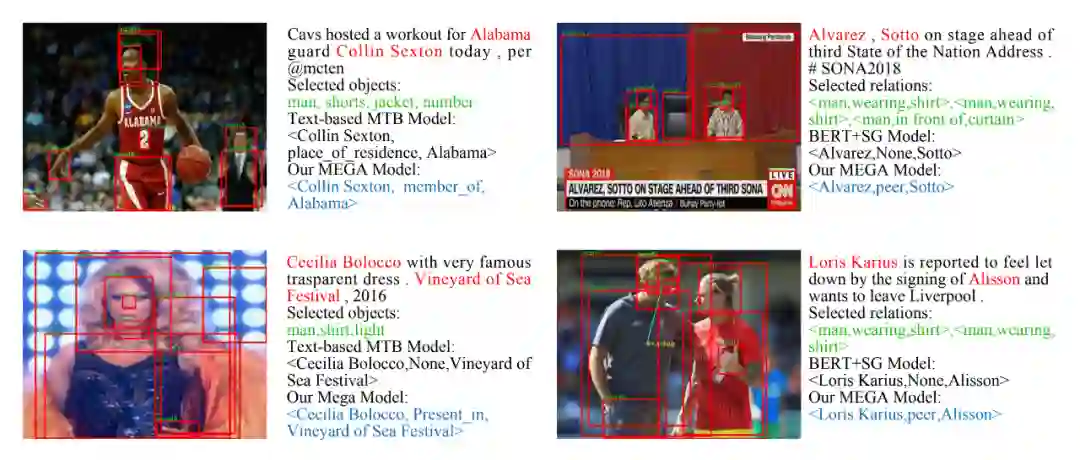,利用视觉场景图与文本依存图结构之间的结构对齐与语义对齐,寻找抽取文本关系最相关的视觉关系,从而提升关系抽取在社交媒体文本上的性能。为了验证模型的有效性,我们建立了基于 Twitter 数据的多模态关系抽取数据集 MNRE,在该数据集上的实验结果表明,MEGA 模型能够利用视觉信息补充缺失的文本语义,同时利用对齐的视觉与文本关系提升关系抽取的性能。