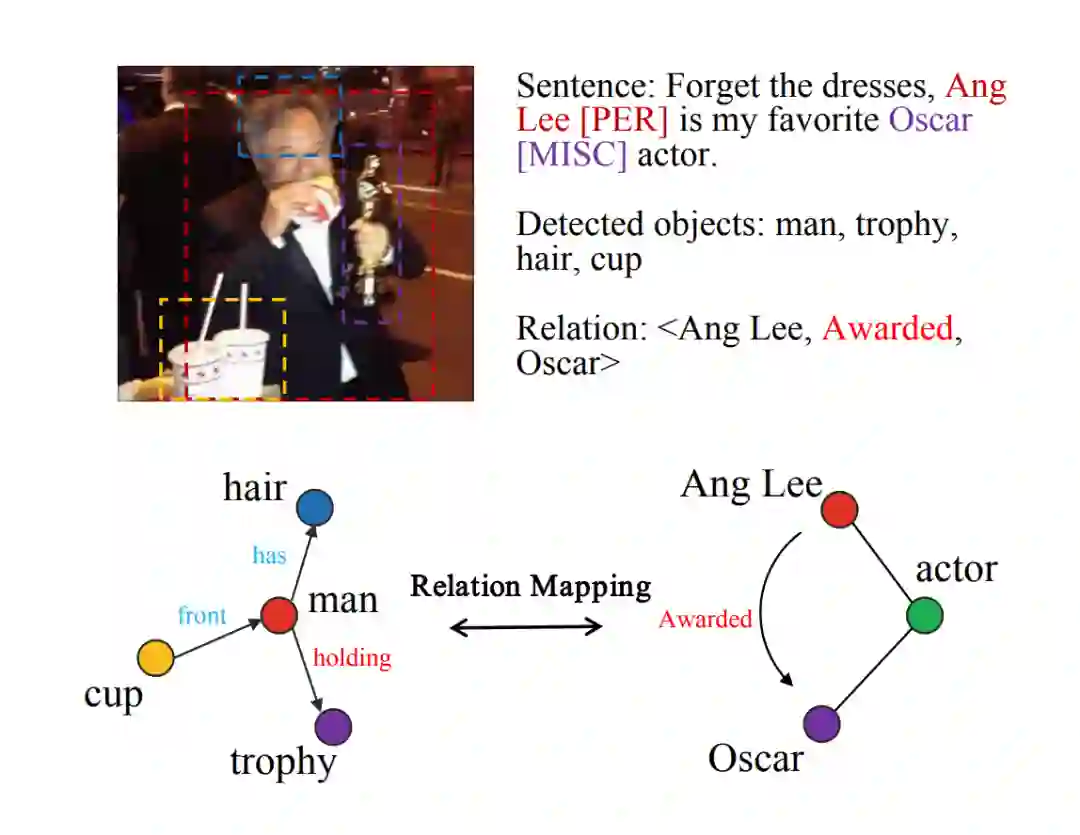 不同于以往的多模态任务,我们发现利用视觉信息辅助模型进行关系抽取不仅需要捕捉视觉对象和文本实体之间的相关性,更需要利用图片中不同视觉对象之间的关系来辅助理解文本中不同实体之间的关系。例如,在图 1 中,仅仅依靠文本我们无法推断“Ang Lee”和“Oscar”之间存在获奖“Awarded”的关系,但是我们可以通过图片中人(man)和奖杯(trophy)之间存在握着(holding)的视觉关系,辅助模型正确的识别出获奖这一文本关系。