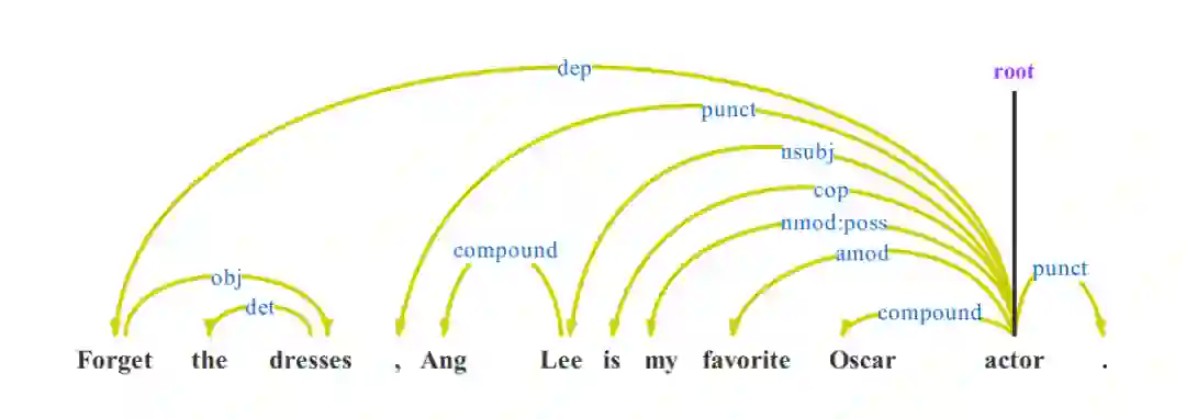具体来说,我们采用 Elmo 作为依赖树提取工具,用于获取输入文本的依存树,然后将文本中的每个单词通过依存关系连接并获得其相关的依存三元组。如图 3 所示,输入句子通过依存解析以获得单词之间的关系(例如,amod,cop)。蓝色的词表示依存关系。箭头的结尾表示这个词既是从属词也是修饰词。紫色用来表示哪个词是依赖关系的根节点。由于每个单词直接由文本中的另一个单词连接,因此文本的图表示生成为