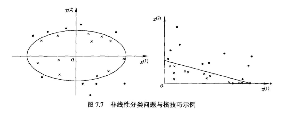非线性支持向量机。当训练数据线性不可分,通过使用核技巧及软间隔最大化,学习非线性支持向量机。
