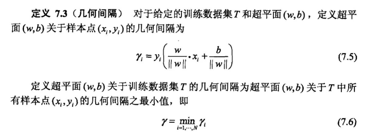 所以我们想到了对超平面的法向量 W 施加一些约束,比如规范化,使得间隔确定,这就引出了几何间隔: