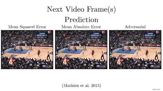 主要是用对抗式训练进行视频预测的,研究解决了一个非常重要的问题,那就是,当你训练一个神经网络(或者其他任何模型)来预测未来,如果要预测的东西有多种可能性时,一个网络以传统的方式进行预测(比如,用最小平方),将会预测出所有可能性的平均值。在视频的例子中,有很多模糊的混乱。对抗式训练能让系统产出其想要的任何东西,只要是在鉴别器喜欢的任何数据库内就可以,这解决了在不确定条件下进行预测的“模糊”难题。