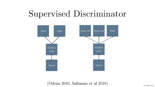 将产生式对抗网络(GAN)拓展到半监督学习,通过强制判别器来输出类别标签。我们在一个数据集上训练一个产生式模型 G 以及 一个判别器 D,输入是N类当中的一个。在训练的时候,D被用于预测输入是属于 N+1的哪一个,这个+1是对应了G的输出。这种方法可以用于创造更加有效的分类器,并且可以比普通的GAN 产生更加高质量的样本。
