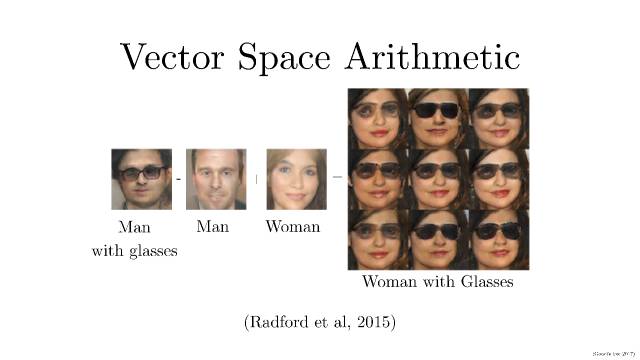 熟悉NLP 的同学可能发现了,这就很像 word2vec 里面的:king- man + woman = queen。做个向量/矩阵加减并不难,难的是把加减后得到的向量/矩阵还原成「图义」上代表的图片。在 NLP 中,word2vec 是把向量对应到有意义的词。在这里,DCGAN 是把矩阵对应到有意义的图片。即:戴墨镜的男人 - 不戴墨镜的男人 + 不戴墨镜的女人= 戴墨镜的女人