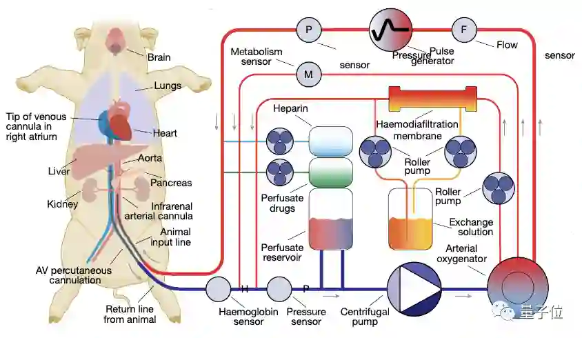 OrganEx比“人工肺”ECMO复杂一些,除了心肺,还模仿了肾的功能,具体包括离心泵、脉冲发生器、血液透析滤过仪、气体输注/药物输送系统和传感器(用于测量代谢和循环参数)。